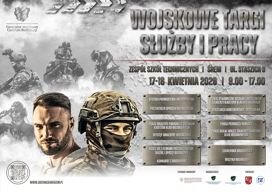 Ministerstwo Obrony Narodowej oraz Centralne Wojskowe Centrum Rekrutacji w 16 miejscowościach w całym kraju, po jednej w każdym województwie organizują kolejną edycję Wojskowych Targów Służby i Pracy. W województwie wielkopolskim przedsięwzięcie to będzie miało miejsce w Zespole Szkół Technicznych im. Hipolita Cegielskiego w Śremie przy ul. Stanisława Staszica 3 oraz w przylegającej do szkoły hali sportowej Śremskiego Sportu. Wydarzenie to odbędzie się w piątek i sobotę (17-18 kwietnia) w godzinach od 9:00 do 17:00.
